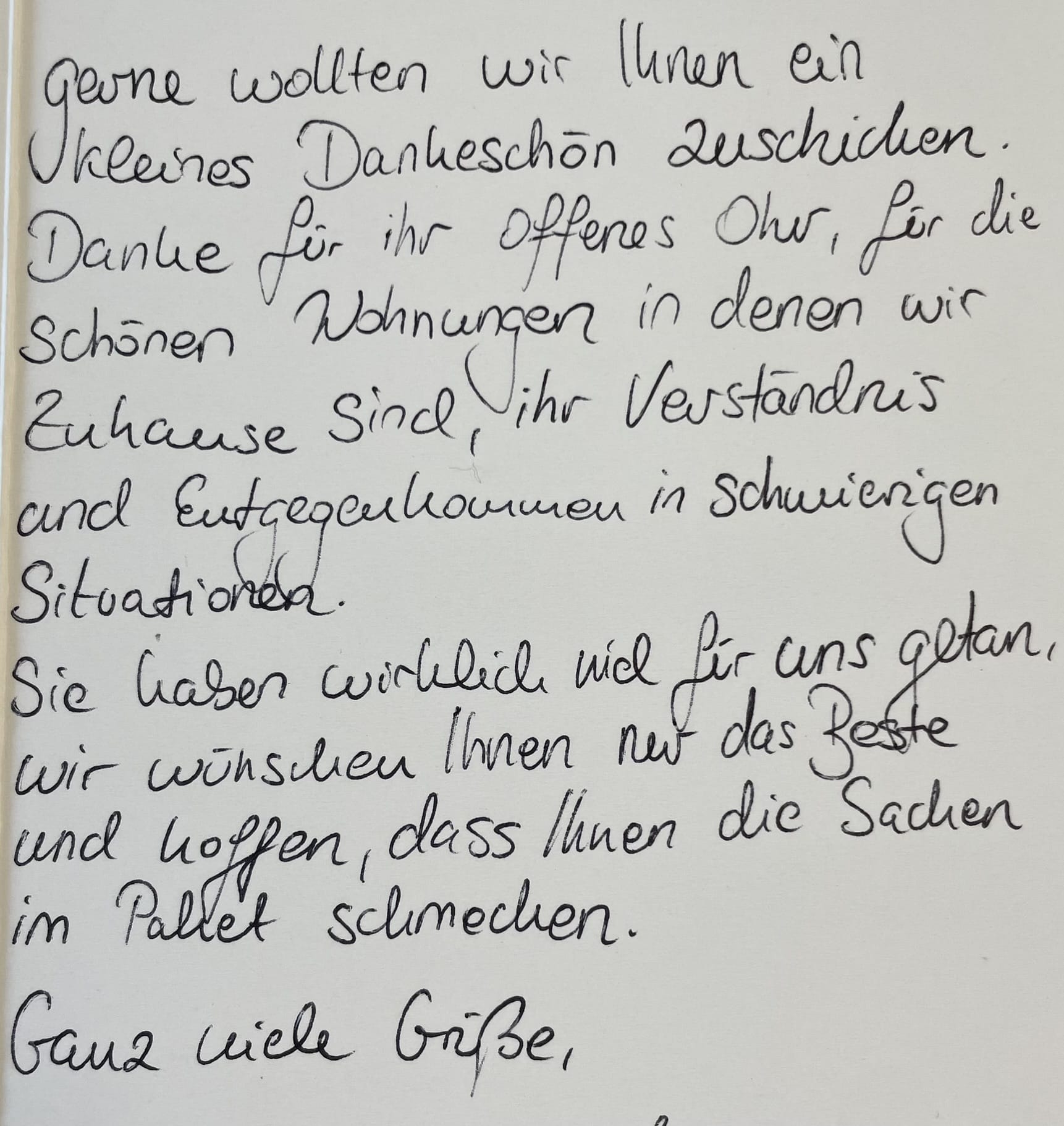 Ein handgeschriebenes Dankeschön eines Mieters hat uns kürzlich sehr gefreut und zeigt, wie wichtig Vertrauen, Verständnis und ein offenes Ohr im täglichen Miteinander sind.