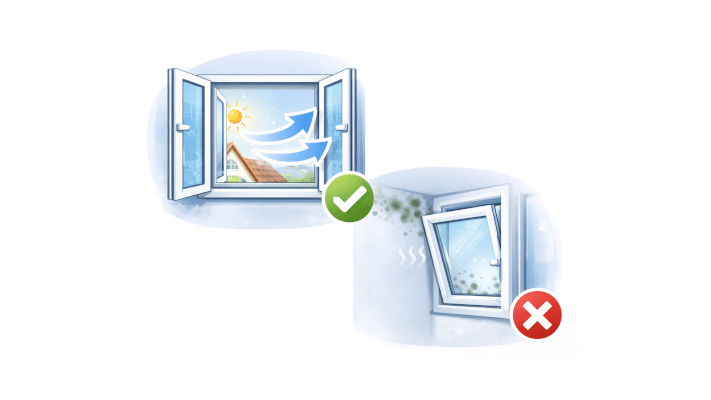 Fenster weit öffnen. Dauerhaft gekippte Fenster lassen die Wände auskühlen und erhöhen das Schimmelrisiko.